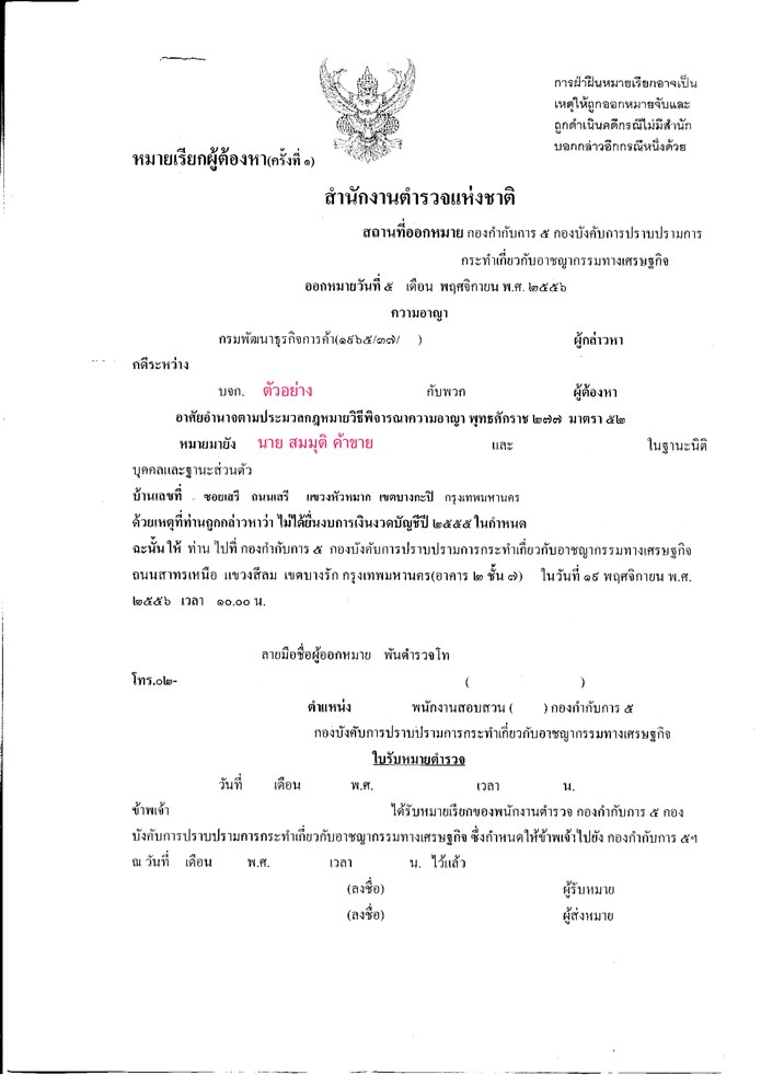 ตัวอย่าง หมายเรียกสำนักงานตำรวจแห่งชาติ (หมายเรียกผู้ต้ัองหา) ครั้งที่ 2